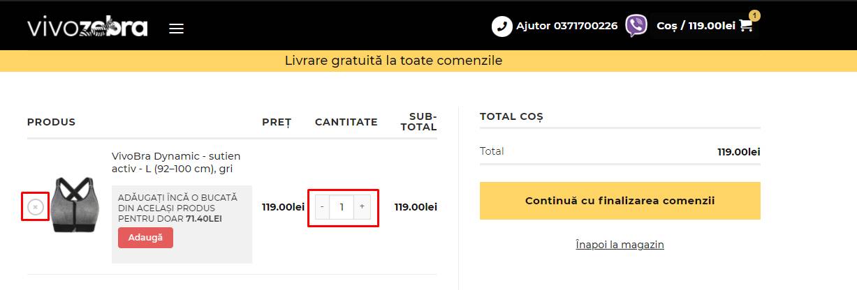 Înainte de finalizarea comenzii, veți fi direcționat către „PREVIZUALIZARE COȘ” (PREVIEW CART), unde puteți să modificați cantitatea de produse sau să eliminați produsul din coș.