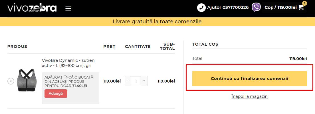 În cazul în care conținutul coșului dumneavoastră este corect și doriți să finalizați achiziția, faceți clic pe butonul „Continuați către pasul final” (Proceed to checkout). Dacă doriți să adăugați produse în coșul dumneavoastră de cumpărături sau să navigați prin magazinul nostru online, faceți clic pe butonul „Înapoi la magazin” (Back to shop)”, situat sub butonul „Continuă cu finalizarea comenzii” (Proceed to checkout)